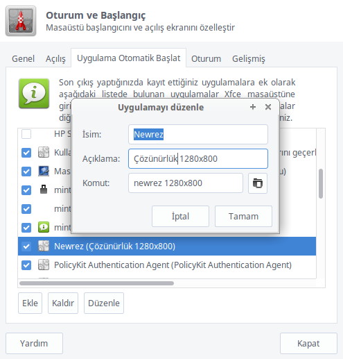 [FONT=&quot]İsterseniz Newrez için iki tane başlangıç ekleyerek (bir tane varsayılan çözünürlük olan 1024x600, bir tane de kendi istediğiniz çözünürlükte) Oturum ve Başlangıç penceresinden dilediğinizi seçebilirsiniz. Bilgisayarınızı yeniden başlattığınızda hangisini seçtiyseniz o şekilde başlayacaktır. [/FONT]