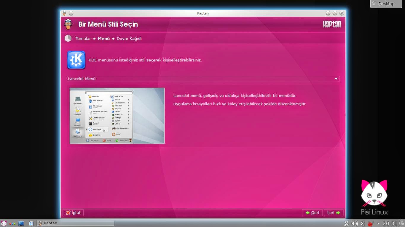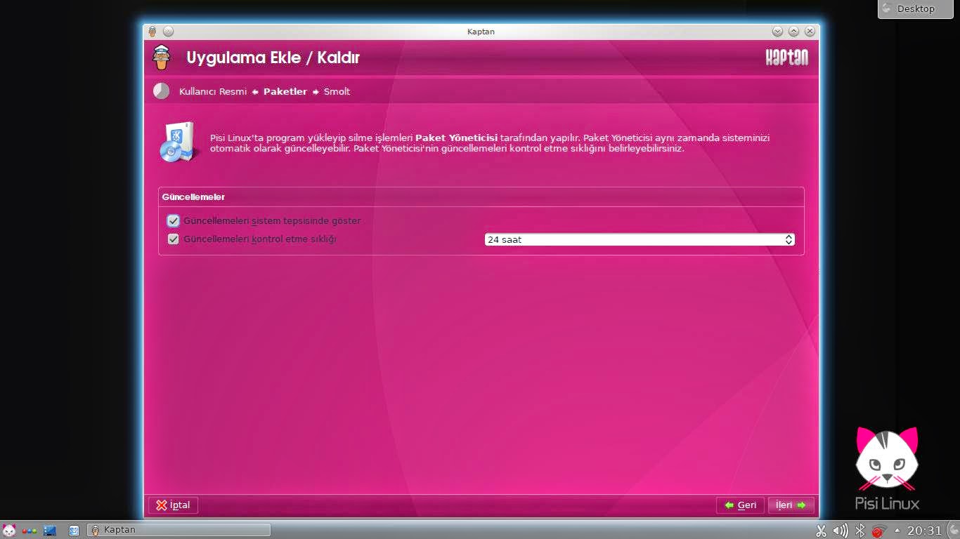 Pisi Linux KDE'yi kurduktan sonra ilk defa açılınca ilk olarak sadece ona özgü olan Kaptan uygulaması çalışıyor.